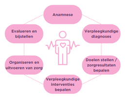 Het maakt niet uit of je binnen het ziekenhuis, de wijkverpleging, de GGZ, de gehandicaptenzorg of welke andere zorgsector je stage loopt of werkt: het verpleegkundig proces is universeel toepasbaar op alle zorgvragers. Het maakt daarbij ook niet uit of de zorgvrager een chronische aandoening heeft, of juist een acute ziekte; de stappen binnen het verpleegkundig proces blijven hetzelfde. De stappen zijn achtereenvolgens: anamnese, diagnose, doelen stellen/zorgresultaten bepalen, interventies bepalen, organiseren/uitvoeren van zorg en als laatste het evalueren en bijstellen van de zorg (Wilkinson, 2019). Het verpleegkundig proces vormt daarmee dan ook de basis van het verpleegkundig beroep; het geeft sturing aan wat je als verpleegkundige gaat doen qua zorgverlening.